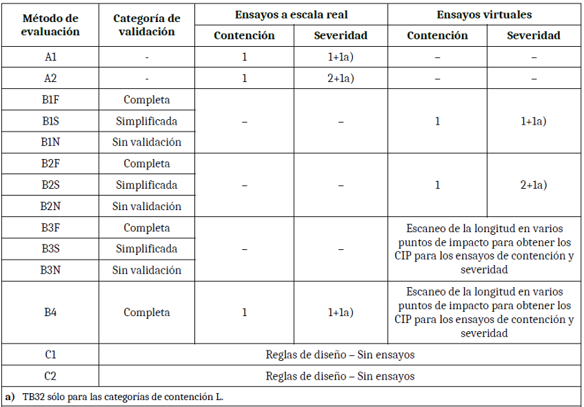 Sin embargo, la Nota Técnica también señala que la administración aún no se ha posicionado sobre cuál de los métodos de evaluación debe utilizarse en cada caso, dependiendo de las características de las barreras y pretiles a conectar o de las condiciones particulares de la vía.